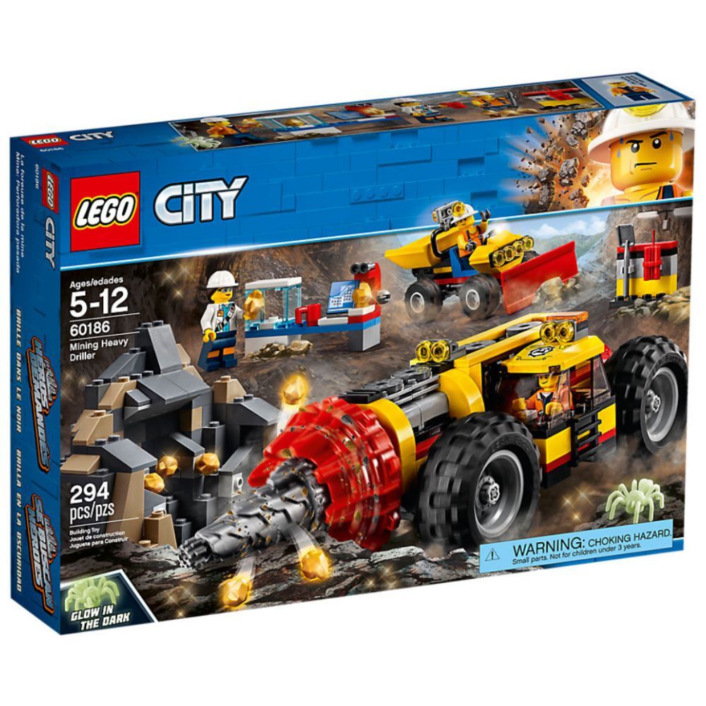 Nimm deinen Arbeitshelm und mach neue Funde mit dem LEGO® City Schweres Bohrgerät für den Bergbau. Dieses Unterhaltungsspielzeug enthält ein funktionierendes schweres Bohrgerät mit Kabine für eine Minifigur, Schaufellader mit Lademulde, ein Mini-Stollen mit Goldklumpen-Elementen und ein mobiles Labor. Enthält 3 Minifiguren und eine Spinnenfigur, die im Dunkeln leuchtet.