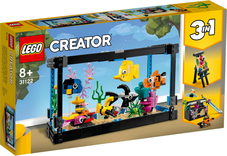 Das LEGO® Creator 3-in-1-Bauset „Aquarium“ (31122) lässt Kinder in eigene Unterwasserabenteuer abtauchen. In dem scheibenlosen Aquarium befinden sich 5 farbenfrohen Fische – ein Clownfisch, ein Paletten-Doktorfisch, ein Kardinalfisch, ein Gelber Segeldoktorfisch und ein Fahnenbarsch – sowie ein Mini-U-Boot, einige Korallen und eine Wasserpflanze.